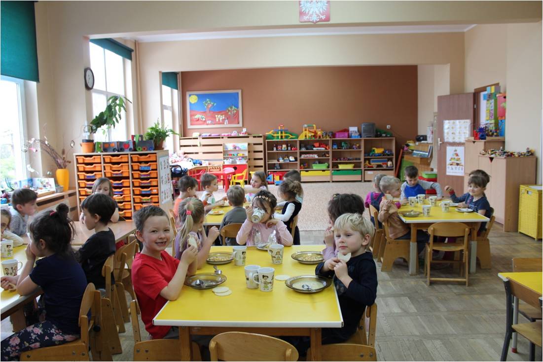 Dzieci korzystają z trzech posiłków: śniadania o godz. 830, drugiego śniadania o godz. 1130, oraz obiadu o godz. 1330. Posiłki dostosowane są do zapotrzebowania kalorycznego małego dziecka.