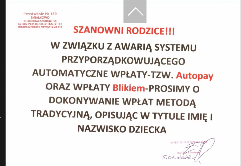 UWAGA RODZICE! WAŻNA INFORMACJA DOTYCZĄCA PŁATNOŚCI!